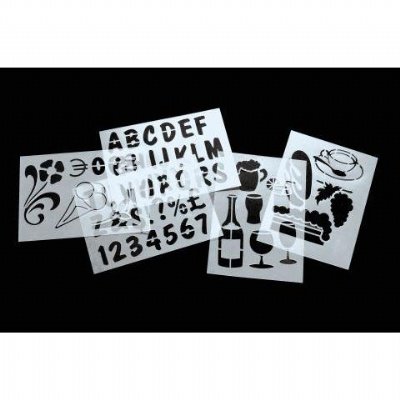 Sjablonen - set van 5 stuks voor het werken met krijtstiften en andere markers. Cijfer- en letterhoogte 6 cm. Figuren 15-17 cm hoogte